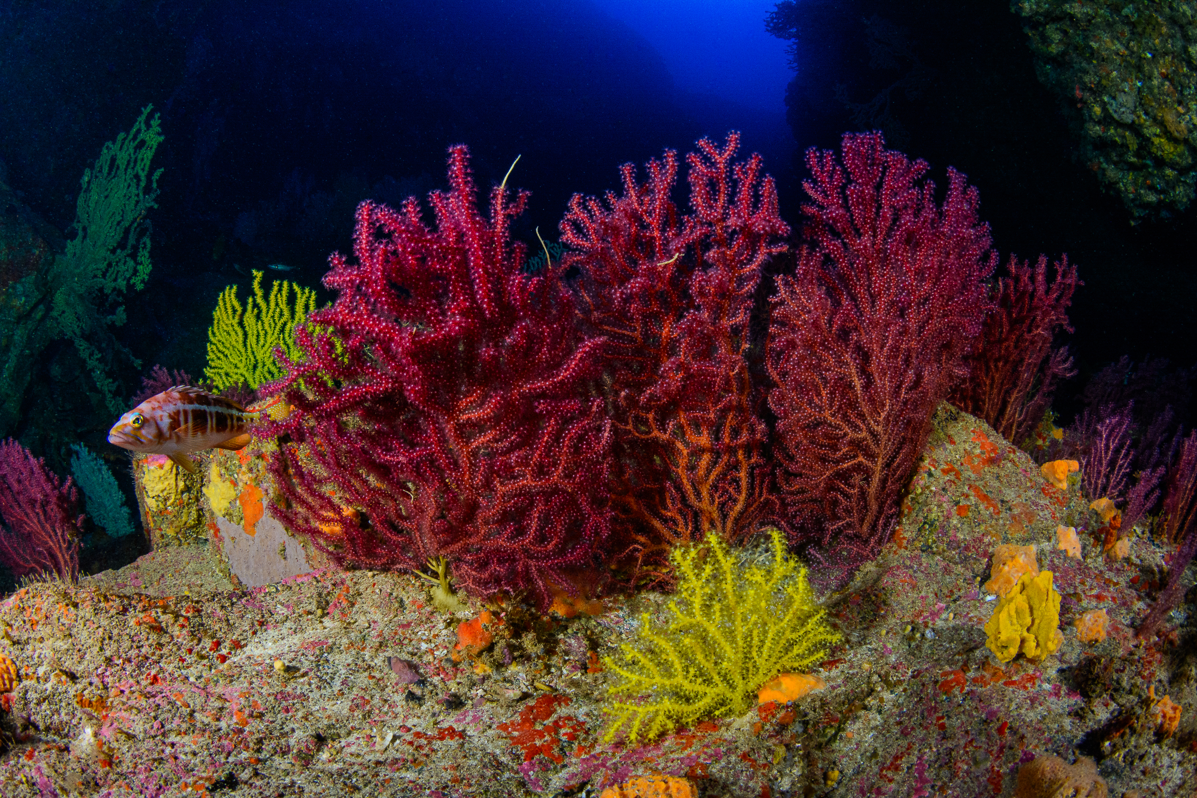 Canarias es un archipiélago volcánico donde el fondo marino desciende rápidamente. A pocos metros de la costa, comienzan paredes y barrancos que se hunden hacia los cientos y miles de metros. Esta geografía abrupta crea muchos tipos de hábitats en un espacio muy reducido, especialmente en zonas profundas donde la luz no llega y la temperatura del agua se mantiene estable.