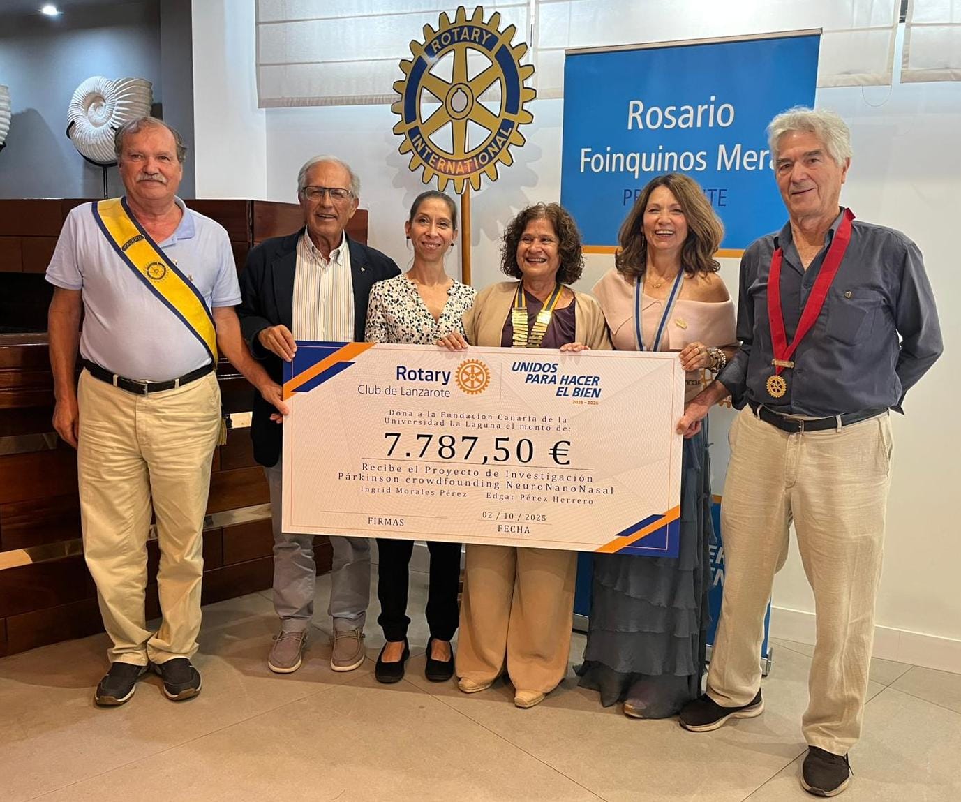 El pasado viernes, 3 de octubre, el Club de Lanzarote de Rotary nos hizo entrega de un cheque de 7.787,50 € en el Hotel Lancelot en Arrecife para seguir avanzando en nuestro proyecto NEUROnanoNASAL. El dinero fue recaudado a través de un torneo de golf organizado por el Club de Lanzarote de Rotary. Estamos muy agradecidos por el apoyo de Rotary Lanzarote.